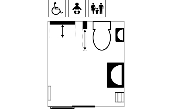 洋式便座/流し/横折畳式ベビーベッド/上下可動式手すり/トイレ流しボタン/温水洗浄ボタン/非常ボタン