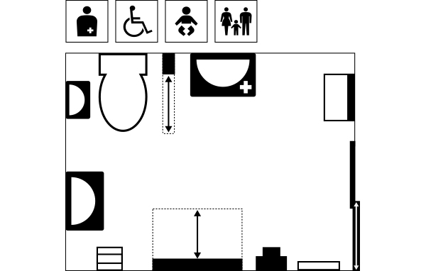 洋式便座/流し/オストメイト流し台/横折畳式ベビーベッド/上下可動式手すり/ゴミ箱/トイレ流しボタン/温水洗浄ボタン/非常ボタン/ベビーチェア