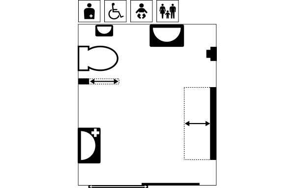 設備洋式便座/温水洗浄ボタン/トイレ流しボタン/背もたれ/手洗器/オストメイト洗浄/非常ボタン/介助シート(パブリックシート)/ベビーチェア/ゴミ箱
