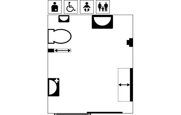 洋式便座/温水洗浄ボタン/トイレ流しボタン/背もたれ/手洗器/オストメイト洗浄/非常ボタン/介助シート(パブリックシート)/ベビーチェア/ゴミ箱