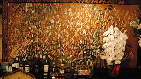 店里的一面墙上贴满了千社札(一种祈愿用的符牌。)