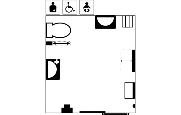 洋式便座/温水洗浄ボタン/トイレ流しボタン/背もたれ/手洗器/オストメイト洗浄/非常ボタン/ベビーチェア/横折畳式ベビーベッド/着替台/ゴミ箱