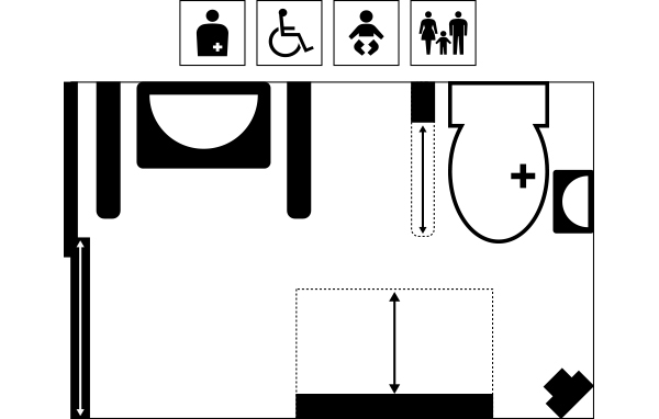 オストメイト対応洋式便座/流し/ベビーチェア/横折畳式ベビーベッド/固定式手すり/上下可動式手すり/タオル/ゴミ箱/トイレ流しボタン/温水洗浄ボタン/非常ボタン