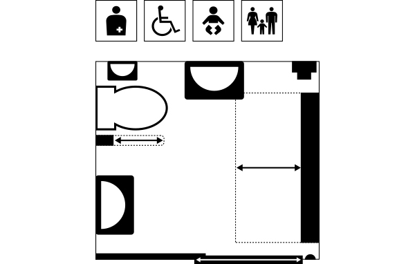 洋式便座/流し/オストメイト流し台/ベビーチェア/横折畳式ベッド/上下可動式手すり/タオル/ゴミ箱/トイレ流しボタン/温水洗浄ボタン/非常ボタン/ドア開閉ボタン