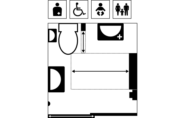 洋式便座/流し/オストメイト流し台/ベビーチェア/縦折畳式ベッド/上下可動式手すり/タオル/ゴミ箱/トイレ流しボタン/温水洗浄ボタン/非常ボタン/ドア開閉ボタン