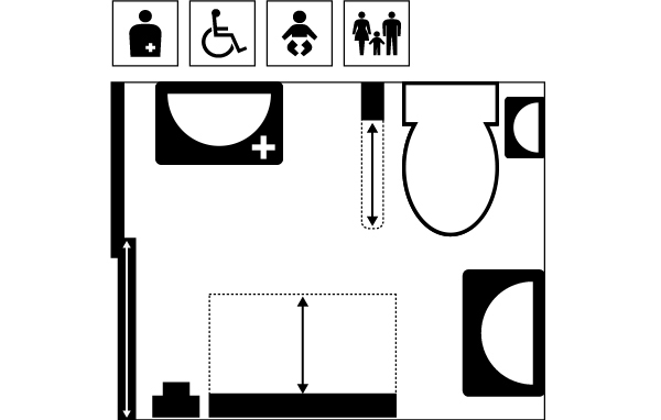 洋式便座/流し/オストメイト流し台/ベビーチェア/横折畳式ベビーベッド/上下可動式手すり/タオル/ゴミ箱/トイレ流しボタン/温水洗浄ボタン/非常ボタン