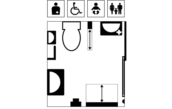 洋式便座/流し/横折畳式ベビーベッド/上下可動式手すり/ゴミ箱/トイレ流しボタン/温水洗浄ボタン/非常ボタン/ドア開閉ボタン